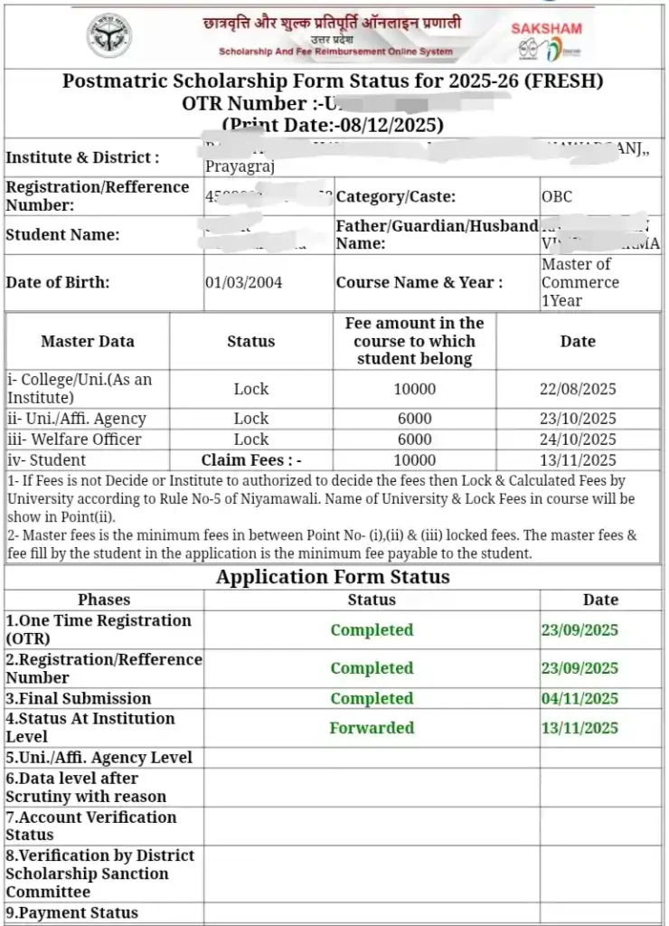 स्टेटस चेक करने से हमें जानकारी मिल जाती है कि एप्लीकेशन की स्थिति क्या है, कॉलेज से फॉरवर्ड हुआ है या नहीं, डिस्ट्रिक्ट लेवल पर फॉरवर्ड किया गया या नहीं, बायोमेट्रिक सक्सेसफुल हुआ है या नहीं, तथा अन्य जानकारी जैसे पेमेंट आदि की डिटेल भी दी गई होती है। छात्रवृत्ति आवेदन की अंतिम तिथि 20 दिसंबर 2025 है।